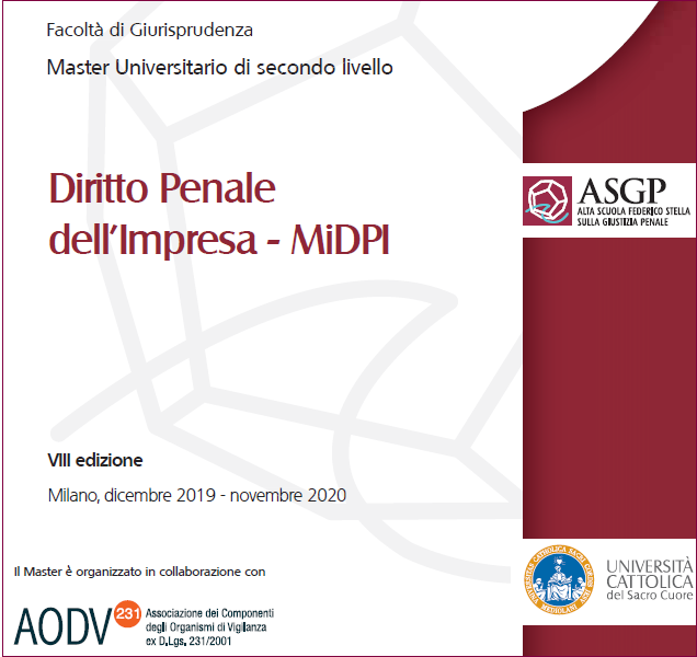 L'Università Cattolica del Sacro Cuore, per iniziativa della Facoltà di Giurisprudenza e dell'Alta Scuola "Federico Stella” sulla Giustizia Penale (ASGP), attiva per l'anno accademico 2019-2020 l'ottava edizione del Master universitario di secondo livello in "Diritto Penale dell'Impresa”.