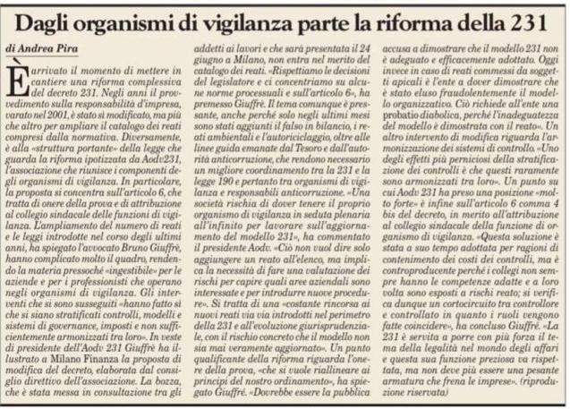Pubblichiamo l´articolo di Milano Finanza del 13 giugno sulla proposta di modifica del Decreto elaborata da AODV231, che accoglie le dichiarazioni del presidente, Avv. Bruno Giuffré